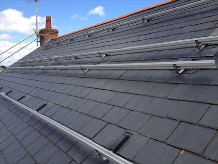 Slate roof work on a 4 kwp array installation of the mounting system on a slate roof in buckley, north wales. we use a new mounting system which keeps all of the weight of the collectors off the tiles. many companies use mounting systems which put all of the load of the panels on the slates which can cause cracked tiles in the future, especially in the winter if the panels have a large amount of snow on them.