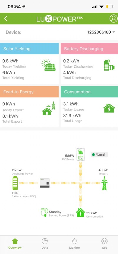 Lux power monitoring application this is lux power monitoring application, we offer remote upgrading free monitoring, real time ,monitoring, advanced power cut protection , grid share income ready, integrated rcd protection, smart export control , max charge and discharge rate 66amps, 10 years warranty, off grid ready , ip65 rated , uk technical support .